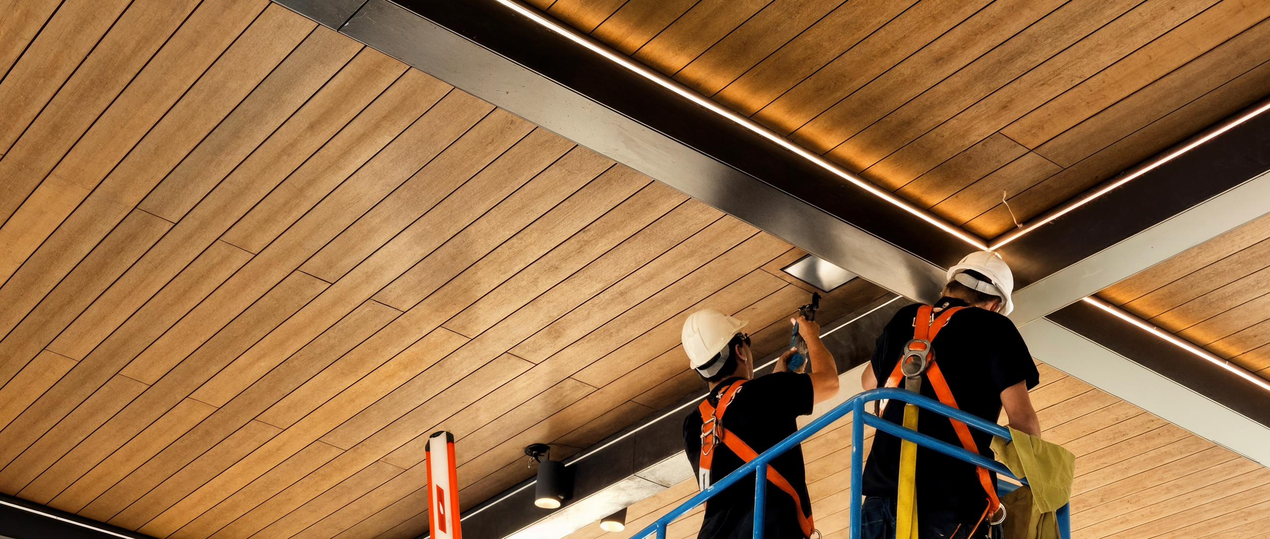 Soluciones decorativas con vigas plásticas sobre estructuras de aluminio tipo parrilla, para espacios interiores y exteriores. Líneas Ciling y Louver de la marca Timberfield.